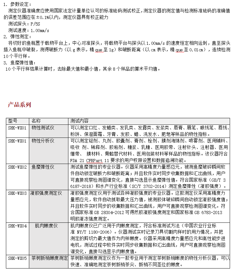 SHK-WX02魚糜彈性儀是測試魚糜彈性的專業(yè)儀器。儀器采用高精度力量感應(yīng)元,被測魚糜破碎瞬間軟件自動(dòng)鎖定破斷力和破斷距離;并且軟件實(shí)時(shí)同步收集數(shù)據(jù)和匯出曲線,用戶可直接觀察檢測圖譜變化,直接勾選顯示魚糜彈性值。符合國家標(biāo)準(zhǔn)(GB/T 36187-2018)和水產(chǎn)行業(yè)標(biāo)準(zhǔn)(SC/T 3702-2014)測定魚糜彈性(凝膠強(qiáng)度)。