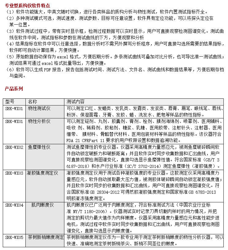肌肉嫩度儀已廣泛用于肉嫩度測定,符合標準測試方法(中國農業行業標準 NY/T 1180-2006)。儀器測試實時記錄刀具切割肉樣時的用力情況,并把測定的剪切力最大值作為肉樣嫩度。儀器采用高精度力量感應元和高性能步進電機,測試過程中軟件實時同步收集數據和匯出曲線,用戶可直接觀察檢測圖譜變化,直接勾選顯示肉嫩度值。