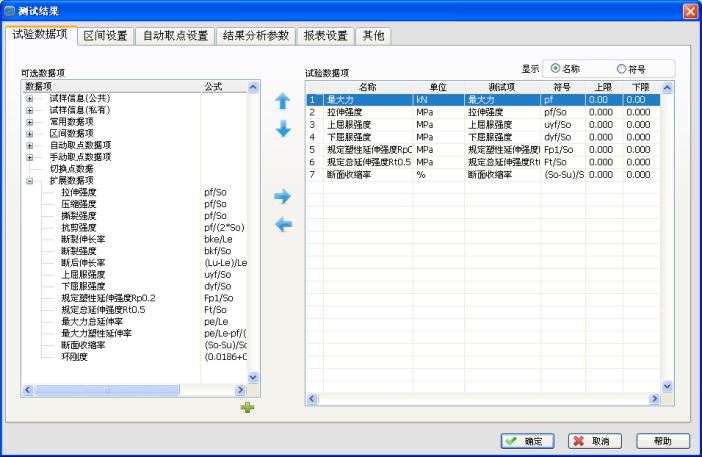 7.測試結束可自動存檔、手動存檔,測試完畢自動求算最大力量、上、下屈服強度、環法、逐步逼近法、非比例延伸強度、抗拉強度、抗壓強度、任意點定伸長強度、定負荷延伸、彈性模量、延伸率、剝離區間最大值、最小值、平均值、凈能量、總能量、彎曲模量、斷點位移x%荷重、斷點荷重X%位移、等等。備份:測試數據可保存在任意硬盤分區。