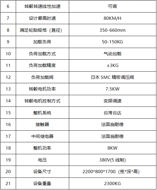 SHK-LT201輪胎耐久試驗(yàn)機(jī)一.參考圖片一.規(guī)格參數(shù)序號類別參數(shù)1設(shè)計(jì)參考標(biāo)準(zhǔn)ISO4249,ISO6054,ISO5995GB/T518,GB/T13204,GB/T13205GB/T31549,GB/T31548,GB/T315472轉(zhuǎn)轂直徑790mm±10mm3轉(zhuǎn)轂跳動(dòng)<0.24轉(zhuǎn)轂不平衡量<5g5轉(zhuǎn)轂最高轉(zhuǎn)速550r/min6轉(zhuǎn)轂轉(zhuǎn)速線性加速可調(diào)7設(shè)計(jì)最高時(shí)速80KM/H8滿足輪胎規(guī)格(直徑)350-