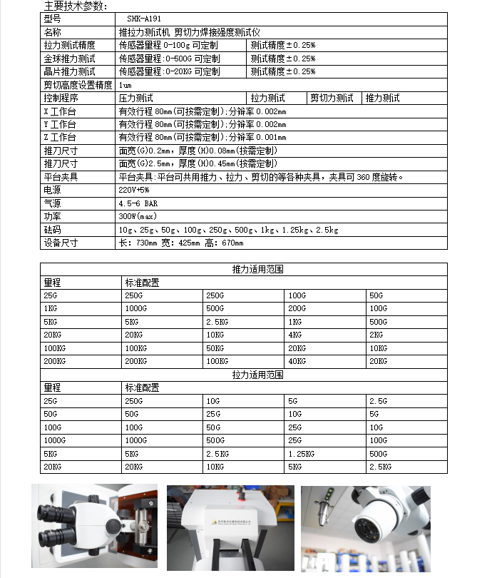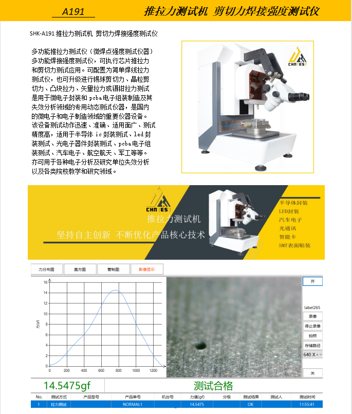 SHK-A191推拉力測試機 剪切力焊接強度測試儀多功能推拉力測試儀(微焊點強度測試儀器) 多功能焊接強度測試儀,可執行芯片推拉力和剪切力測試應用。可配置為簡單焊線拉力測試儀,也可升級進行錫球剪切力、晶粒剪切力、凸塊拉力、矢量拉力或鑷鉗拉力測試是用于微電子封裝和pcba電子組裝制造及其失效分析領域的專用動態測試儀器,是國內的微電子和電子制造領域的重要儀器設備。該設備測試動作迅速、準確、適用面廣、測試精度高,適用于半導