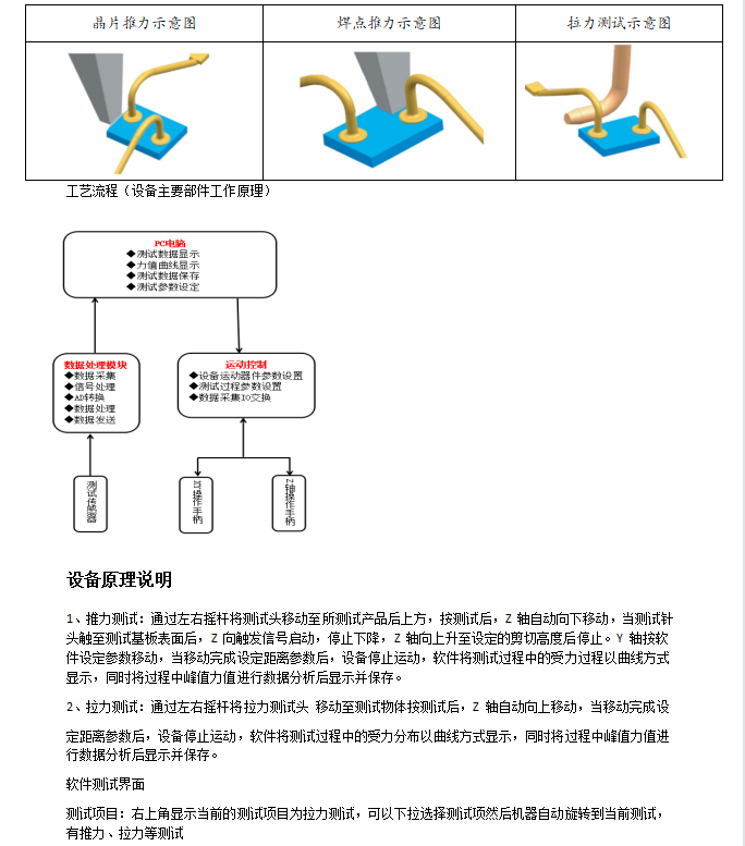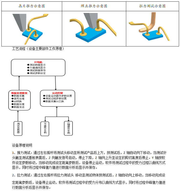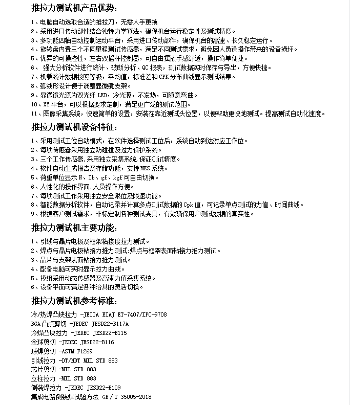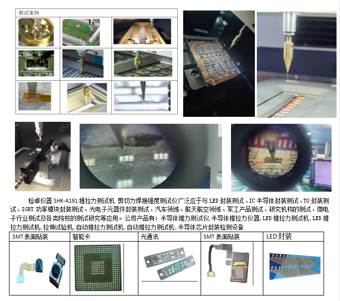 半導體推力測試儀,半導體推拉力儀器,LED推拉力測試機,LED推拉力測試機,拉伸試驗機,自動推拉力測試機,自動推拉力測試機,半導體芯片封裝檢測設備 廣泛應于與LED封裝測試、IC半導體封裝測試、TO封裝測試、IGBT功率模塊封裝測試、光電子元器件封裝測試、汽車領域、航天航空領域、軍工產品測試、研究機構的測試、微電子行業測試及各類院校的測試研究等應用。公司主要產品有:半導體推力測試儀,半導體推拉力儀器,LED推拉力測試機,LED推拉力測試機,拉伸