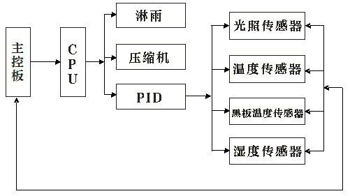 設備通過主控板上的 CPU 分別控制各個功能要求,控制器自動演算 PID 值,使得溫度、 濕度、黑板溫度和光照強度能精確控制。淋雨系統由水泵、時間繼電器、噴嘴等組成,噴灑 周期可調。輻照強度有傳感器直接傳送到控制器,保證傳送精度。